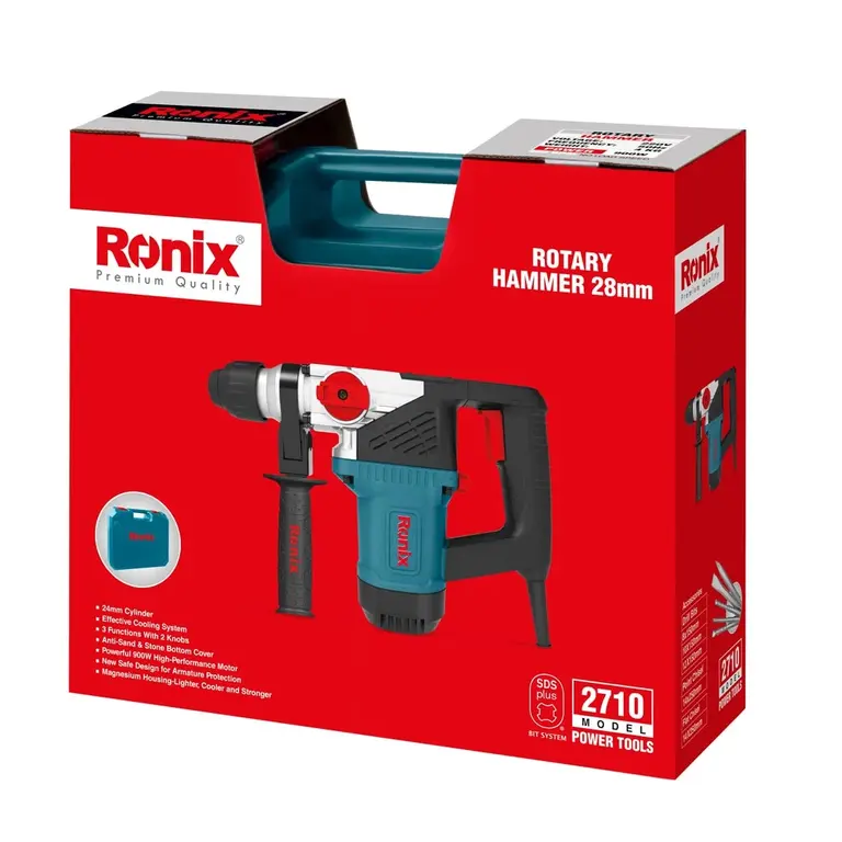 متعلقات : دسته جانبی طراحی رونیکس، میله عمق سنج ، درپوش گرد و غبار ، ظرف گریس، ذغال، (1عدد) مته SDS PLUS 8*150، (1عدد) مته SDS PLUS 10*150، مته SDS PLUS 12*150، قلم نوک تیز 14*250 (1عدد)، قلم سر تخت 14*250 (1عدد)