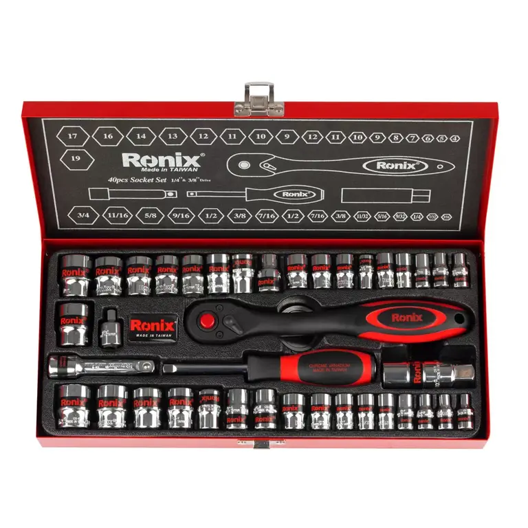 18 عدد سوکت 1/4 اینچی ( 4, 5, 6, 7, 8, 9, 10, 11, 12 5.16, 9.32, 1.4, 7.32, 3.16, 1.2, 7.16, 3.8, 11.32 ) میلی متر و 16 عدد سوکت 3/8 اینچی ( 9, 10, 11, 12, 13, 14, 16, 17, 19 3.4 ) میلی متر